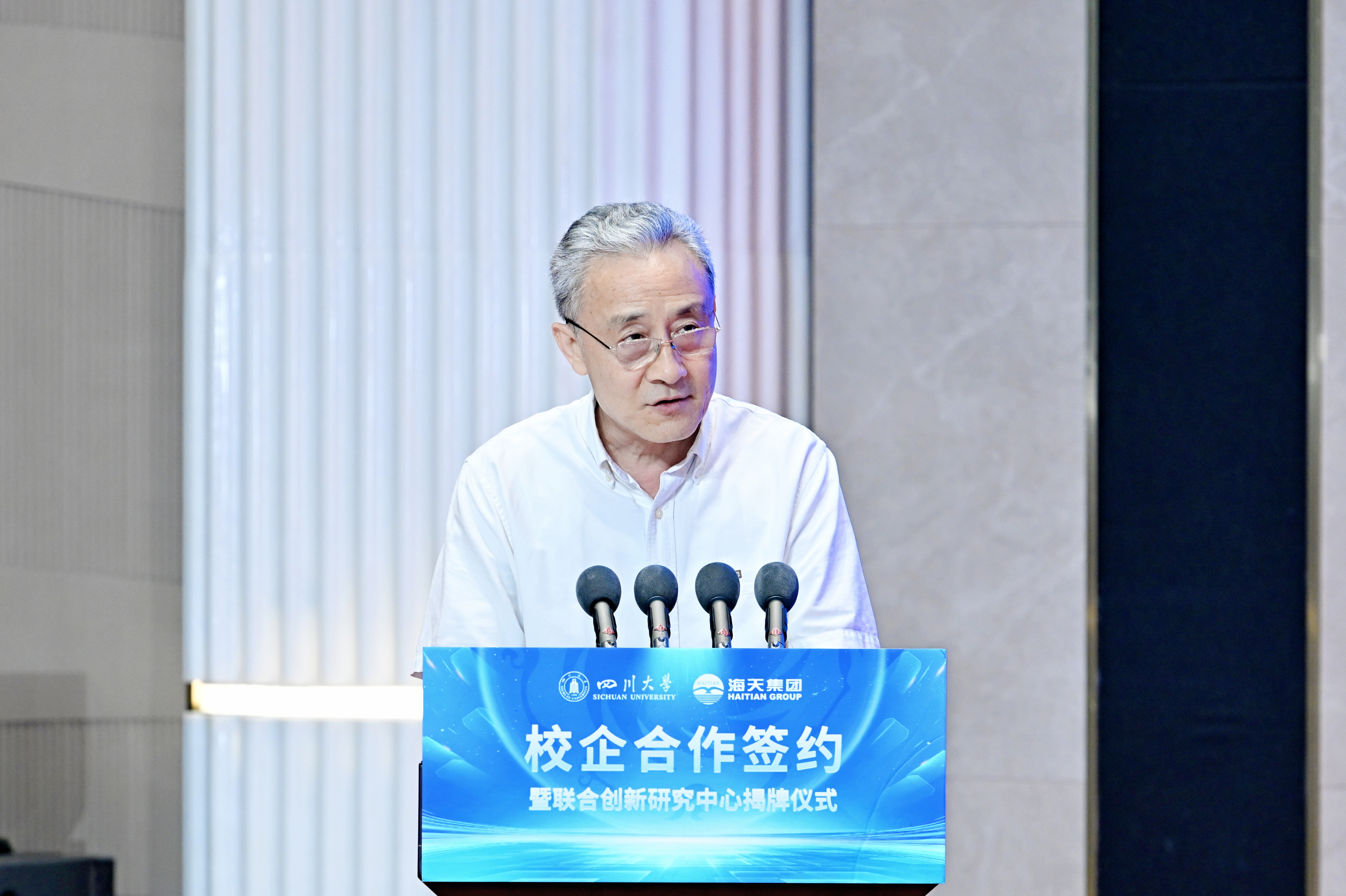 四川大学校长汪劲松表示,校企合作是推动科技创新和产业升级的重要途径。四川大学始终坚持把服务国家作为最高追求,持续强化有组织的科研。海天集团在环保、能源、金融投资等领域深耕多年,川大与海天自2014年建立合作关系以来,在人才培养、科技攻关、成果转化方面取得了突出的成效。本次深化合作协议的签约,既是双方携手共进的新起点,更是积极响应国家创新驱动发展战略、服务区域经济社会高质量发展的务实之举。希望校企双方秉持优势互补、资源共享、共同发展的格局,立足国家战略需求和企业技术需要,围绕环保、新能源、新材料等行业关键的核心技术,共同开展科学攻关和成果应用转化,校企携手推动区域经济社会高质量发展。