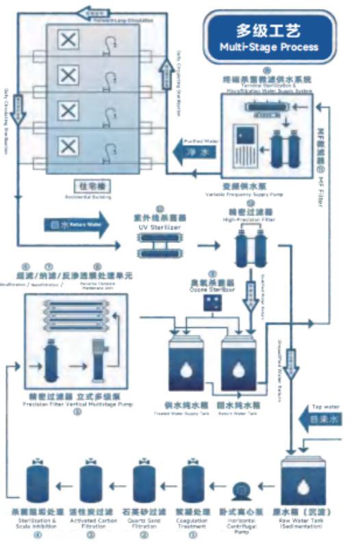 采用臭氧定时杀菌,预防成品水水箱内及管网内的细菌滋生,同时臭氧溶于水形成富氧水,保证水的纯鲜。采用精密过滤进行过滤,对管道中回流至水箱的水再次过滤,预防管道中二次污染的发生,杜绝管道中任何杂质回流至水箱内。