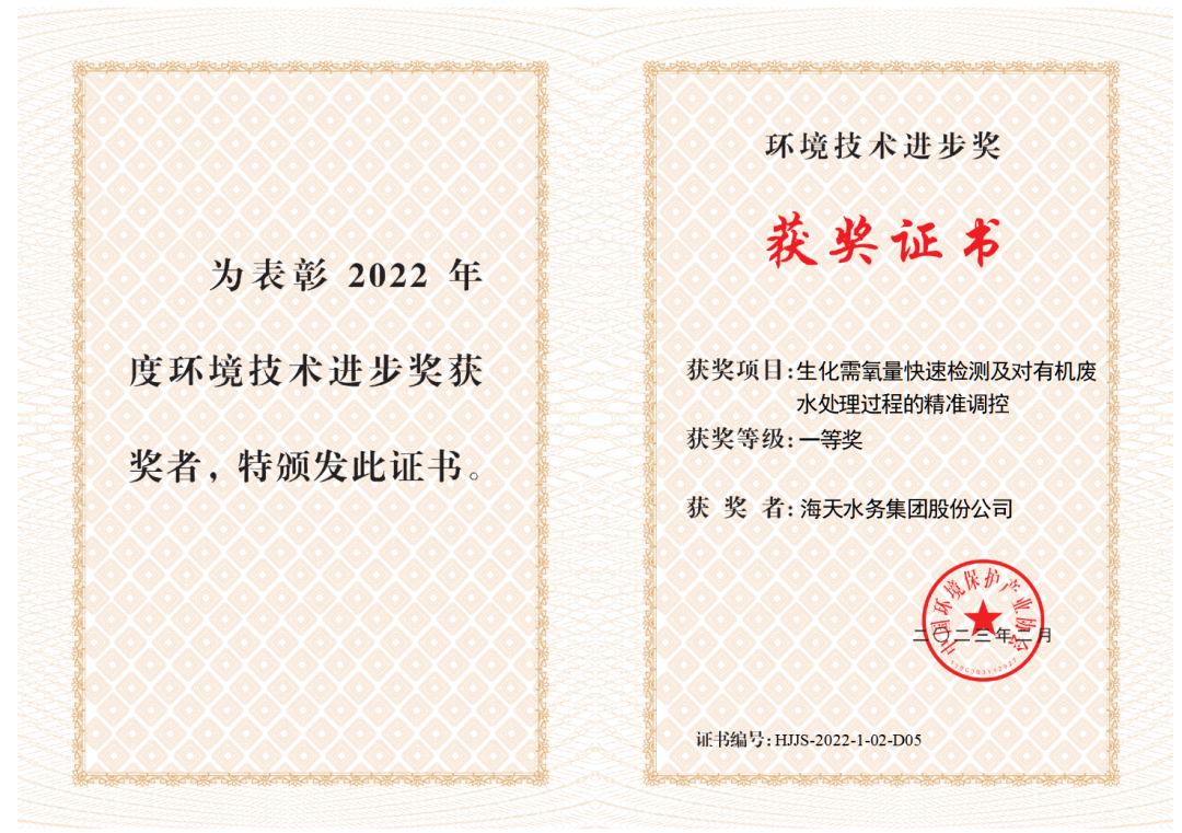 近期,中国环境保护产业协会发布了《关于授予“低维护-短流程村镇供排水净化技术与装备”等27个项目2022年度环境技术进步奖的决定》,海天集团联合中国科学院重庆绿色智能技术研究院、四川大学、中山大学等7家高校、企事业单位共同完成的“生化需氧量快速检测及对有机废水处理过程的精准调控”项目荣获2022年度环境技术进步奖一等奖。