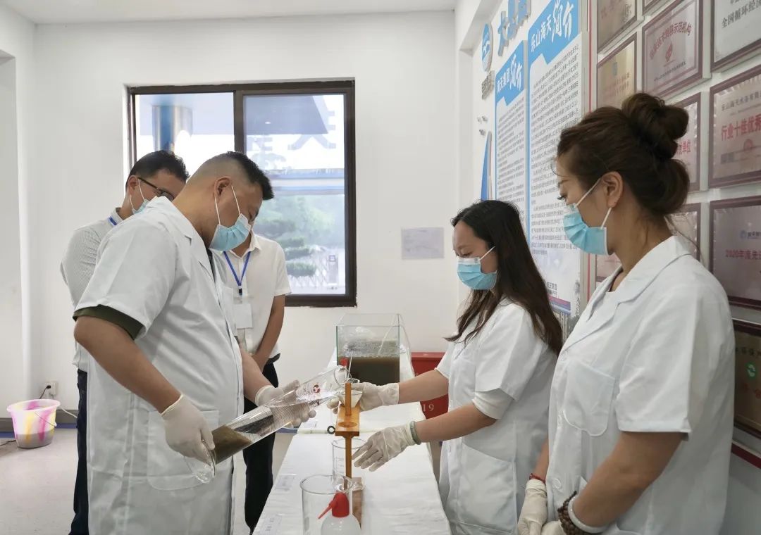 在预处理段和污水排放口,工作人员现场提取了同计量的进出水,参观代表上前仔细观察,为乐山海天高效的污水处理能力点赞。